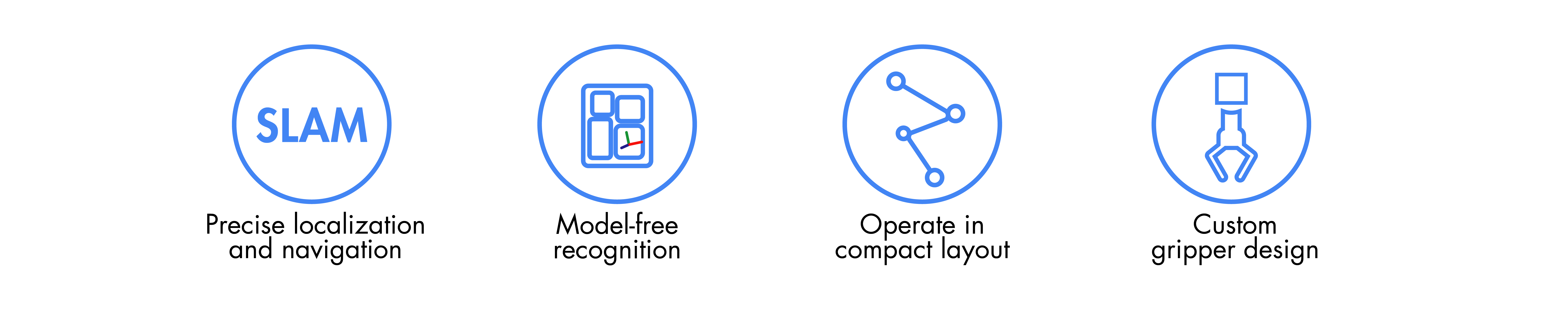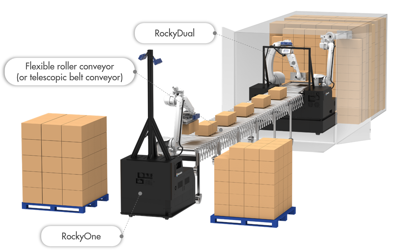 The solution comprises two mobile palletizers, RockyOne with one robot arm and RockyDual featuring two robot arms. Equipped with a mobile base, they can move to designated positions and start operations directly. The two robots also carry comprehensive components such as 3D cameras, vision software Studio Max, algorithms, and custom grippers, which enable them to work without additional infrastructure.