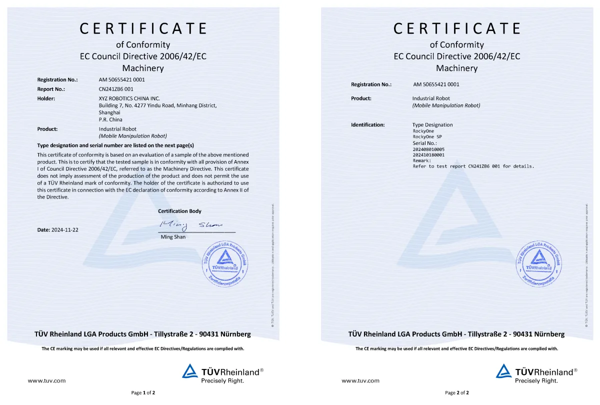 XYZ Robotics is thrilled to announce that our RockyOne Mobile Manipulation Robot has received CE certification issued by the technical testing organization TÜV Rheinland, confirming its compliance with European safety and performance standards. This milestone highlights our commitment to delivering safe, reliable, and high-quality automation solutions to our global customers.